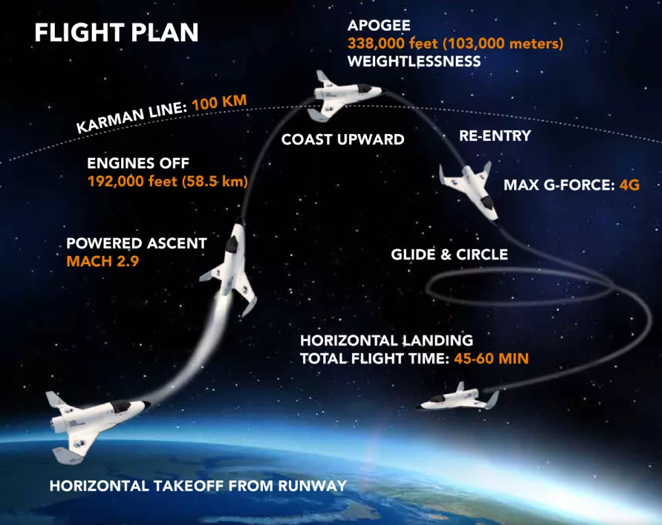 After the air launch, the spacecraft climbs on full thrust to a near vertical attitude. The acceleration builds up to approximately 3 G, after which the engines are shutdown at an altitude of approximately 55 km. The spacecraft is brought in feather configuration for the reentry later on.